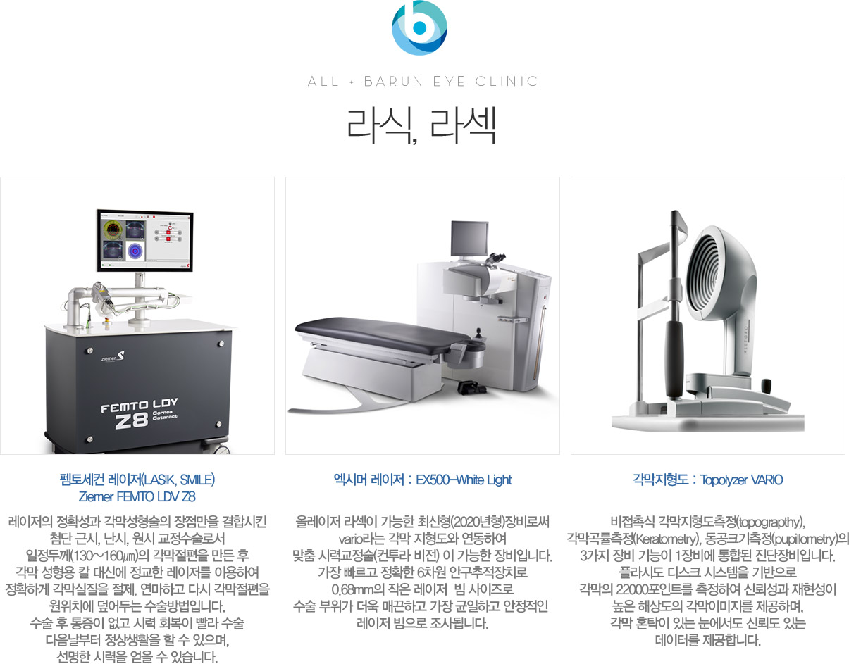 ¶ó½Ä, ¶ó¼½ ¿¢½Ã¸Ó ·¹ÀÌÀú : Schwind AMARIS 500E : all laser ¹æ½ÄÀÇ ¼ö¼úÀÌ °¡´ÉÇÏ¿© ¾ËÄÚ¿ÃÀ̳ª ºê·¯½¬°¡ °¢¸·¿¡ Á÷Á¢ÀûÀ¸·Î Á¢Ã˵ÇÁö ¾Ê±â ¶§¹®¿¡ ¾È±¸°ÇÁ¶Áõ°ú °°Àº °¢¸·ºÎÀÛ¿ëÀ» ÃÖ¼ÒÈ­ ½Ãų ¼ö ÀÖ½À´Ï´Ù. ·¹ÀÌÀú Á¶»ç¼Óµµ°¡ ³ô¾ÆÁö¸é ªÀº ½Ã°£ ³»¿¡ ¸¹Àº ¾çÀÇ ¿­ ¿¡³ÊÁö°¡ °¢¸·¿¡ Á¶»çµÇ¾î °¢¸·È­»óÀ¸·Î ÀÎÇØ »óóġÀ¯ Áö¿¬, °¢¸·È¥Å¹, ±Ù½Ã/³­½Ã °°Àº ±¼ÀýÀÌ»óÀÇ ºóµµ°¡ ³ô¾ÆÁý´Ï´Ù. ÆèÅä¼¼ÄÁ ·¹ÀÌÀú(LASIK, SMILE) Ziemer FEMTO LDV Z8 : ·¹ÀÌÀúÀÇ Á¤È®¼º°ú °¢¸·¼ºÇü¼úÀÇ ÀåÁ¡¸¸À» °áÇÕ½ÃŲ ÷´Ü ±Ù½Ã, ³­½Ã, ¿ø½Ã ±³Á¤¼ö¼ú·Î¼­ ÀÏÁ¤µÎ²²(130~160§­)ÀÇ °¢¸·ÀýÆíÀ» ¸¸µç ÈÄ °¢¸· ¼ºÇü¿ë Ä® ´ë½Å¿¡ Á¤±³ÇÑ ·¹ÀÌÀú¸¦ ÀÌ¿ëÇÏ¿© Á¤È®ÇÏ°Ô °¢¸·½ÇÁúÀ» ÀýÁ¦, ¿¬¸¶ÇÏ°í ´Ù½Ã °¢¸·ÀýÆíÀ» ¿øÀ§Ä¡¿¡ µ¤¾îµÎ´Â ¼ö¼ú¹æ¹ýÀÔ´Ï´Ù. ¼ö¼ú ÈÄ ÅëÁõÀÌ ¾ø°í ½Ã·Â ȸº¹ÀÌ »¡¶ó ¼ö¼ú ´ÙÀ½³¯ºÎÅÍ Á¤»ó»ýȰÀ» ÇÒ ¼ö ÀÖÀ¸¸ç, ¼±¸íÇÑ ½Ã·ÂÀ» ¾òÀ» ¼ö ÀÖ½À´Ï´Ù.